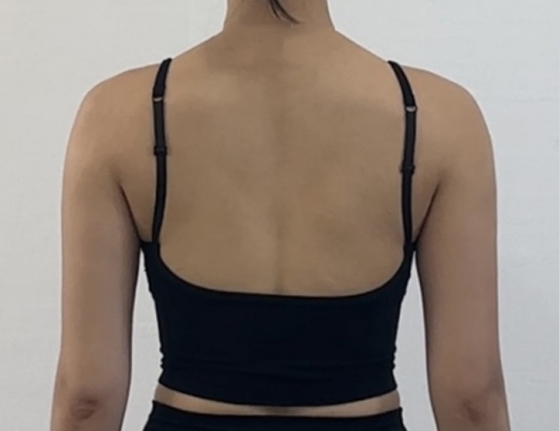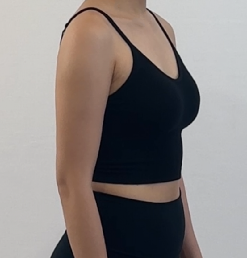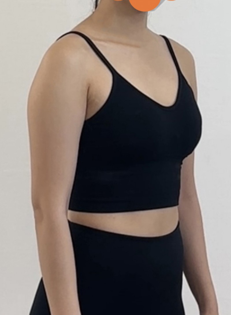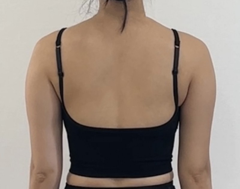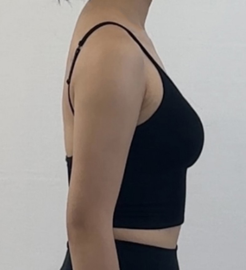 Now that a month has passed, most of the major swelling has gone down. Although it will still take 3–6 months for all the swelling to completely subside, the armpit area and the front view already look much smoother, and my arms are starting to look almost straight.